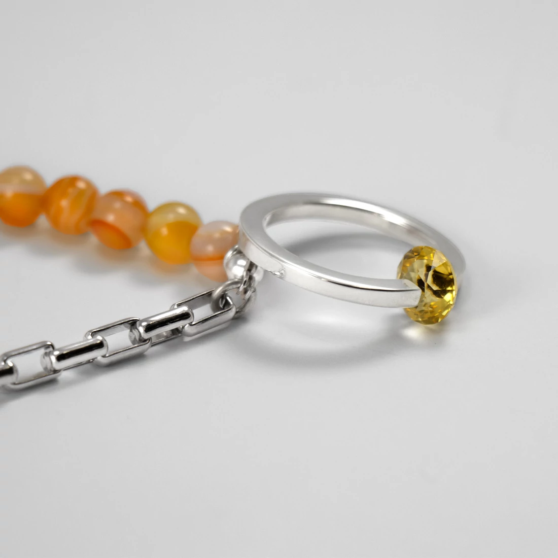 A kollekció védjegyeivel készült kapszulakollekció a nyár vidám, színes hangulatát idézi. A minimál dizájnt a színes achát gyöngyök mellett egy valódi, citrin drágakő egészíti ki. A nyaklánc 46 cm hosszú, az ásványokat pedig egy tömör, hosszúkás anker lánc köti össze.