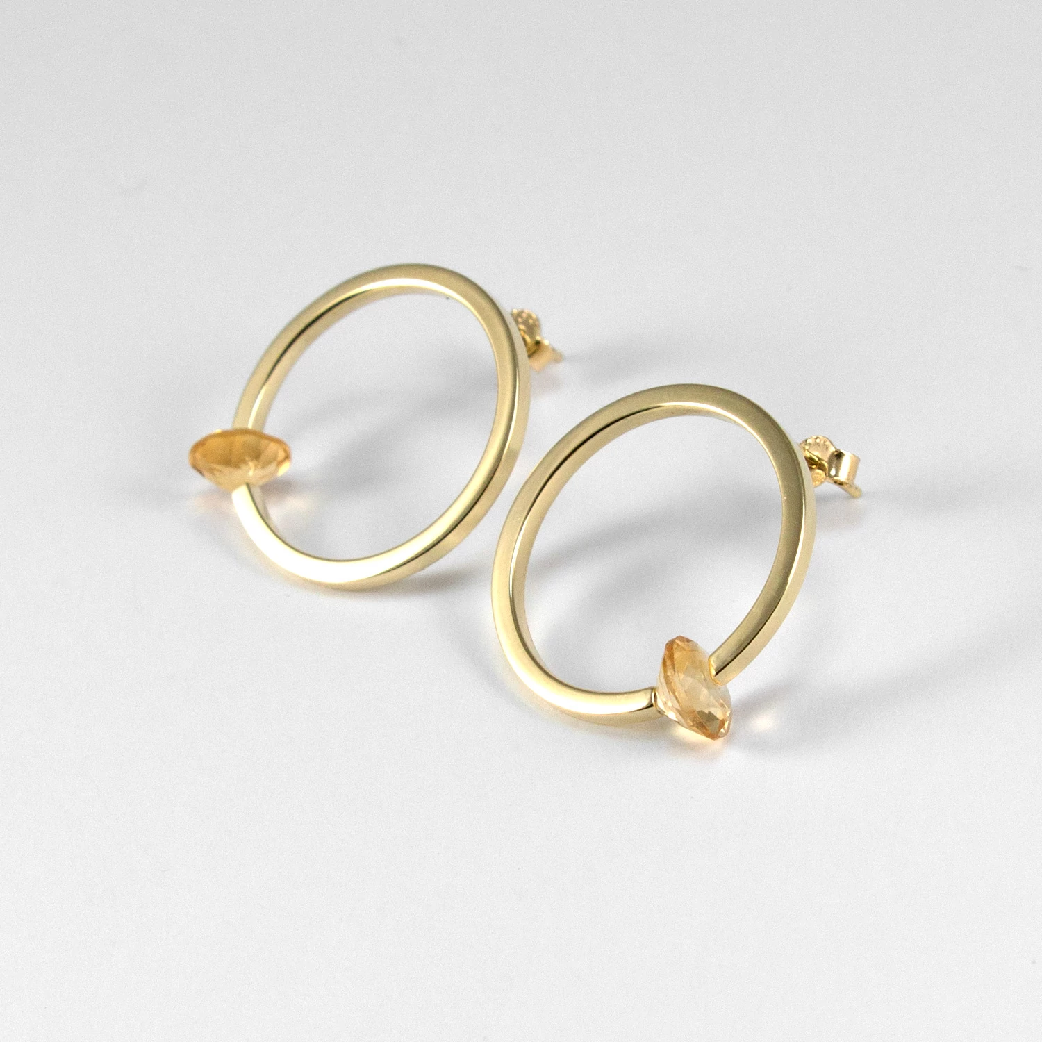 A " FLOATING STONE CITRIN " fülbevaló egyszerű és letisztult designnal rendelkezik, mely a minimalizmus és az elegancia tökéletes ötvözetét nyújtja. Valódi, természetes CITRIN kövek díszítik, az amúgy 14 karátos arany fülbevalót. Kényelmes, egyszerűen hordható bedugós darab, ideális választás mindennapi viseletre és különleges alkalmakra is egyaránt.