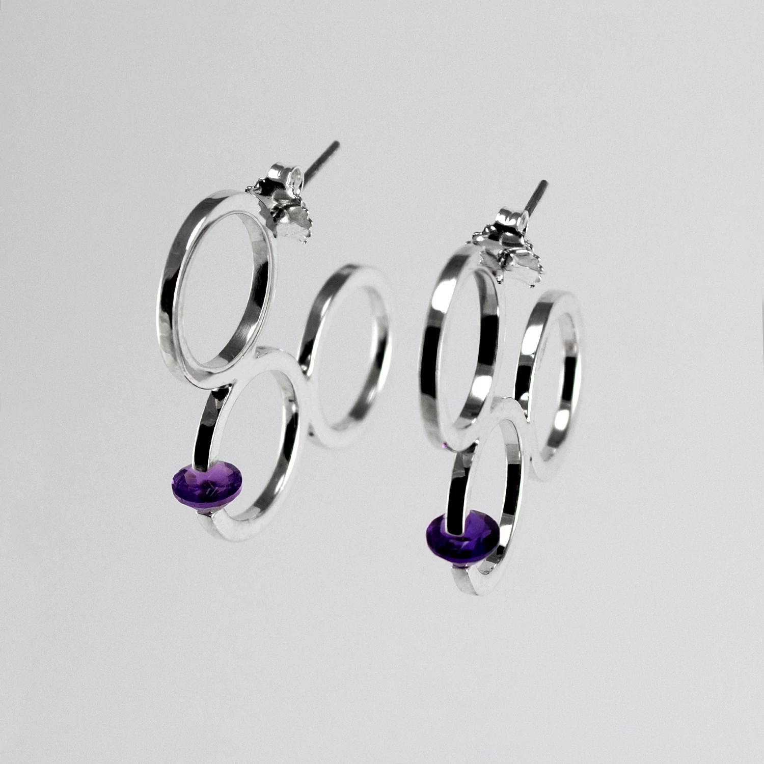 A fülbevaló egyszerű mégis izgalmas, letisztult designnal rendelkezik, mely a minimalizmus és az elegancia tökéletes ötvözetét nyújtja. Valódi, természetes ametiszt kövek díszítik, az amúgy sterling ezüst fülbevalót. Kényelmes, egyszerűen hordható bedugós darab, ideális választás mindennapi viseletre és különleges alkalmakra is egyaránt.