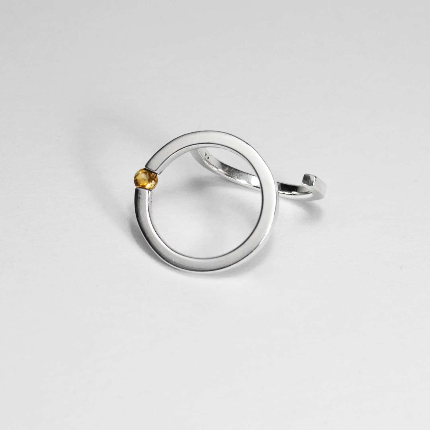 A gyűrű elegáns, letisztult darab. Ezüstből készült, sima, polírozott a felülete. Közepén sárga citrin drágakő található.