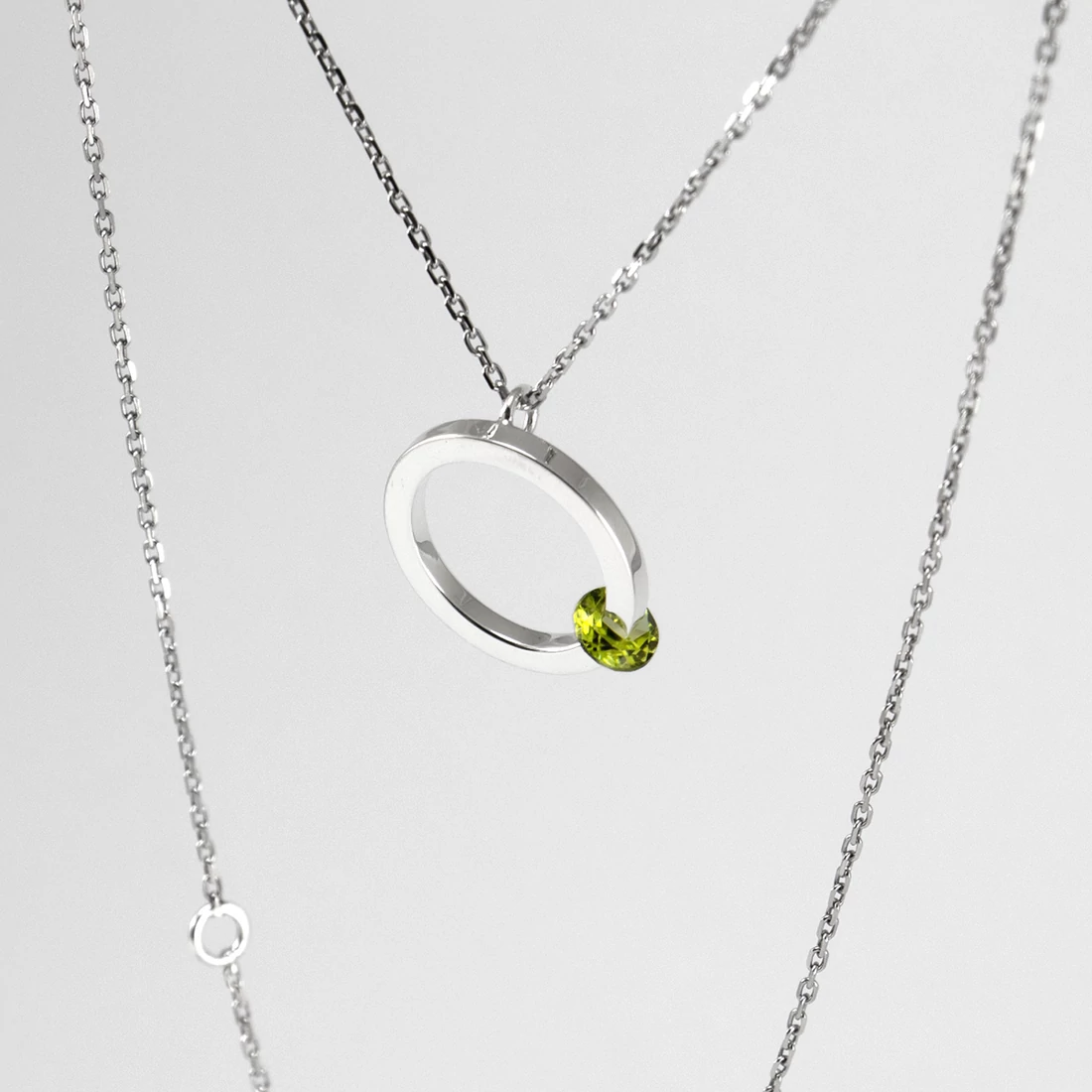 A floating stone ezüst nyaklánc letisztult egyszerű design. Az ékszer központi részén egy valódi zöld peridot olivin kő található. A lánc 45 cm hosszú és állítható. A könnyen kezelhető klasszikus zár segítségével könnyedén lehet kisebbre is alakítani. Ez a nyaklánc tökéletes választás mindennapi viseletre, vagy különleges alkalmakra egyaránt. Ahogy azt a neve is idézi a kő "lebegtetve" feszítve van a két anyag között, ezért alváshoz, fürdéshez miden esetben ajánlott pihentetni.