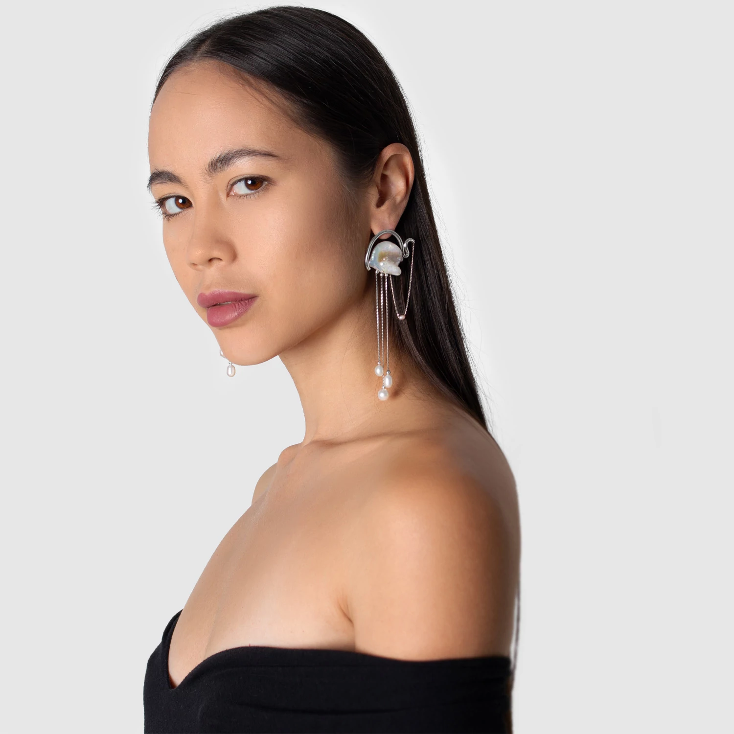 A Medúza barokk gyöngy fülbevaló nem csupán ékszer, hanem a tenger mélyének művészi interpretációja. A nagyobb gyöngy finom rögzítése és a kisebb gyöngyök láncon való lebegése a medúzák légies, finom mozgását idézik.