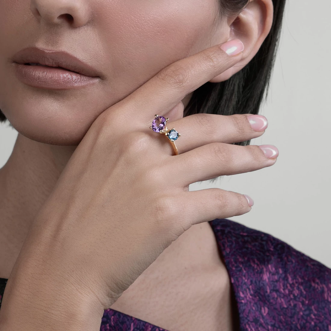 A "MOLD ART" gyűrű öntési technológiával készült tömör 14 karátos, 585% finomságú aranyból. A gyűrű központi részén, lekerekített dupla karmos foglalatba lila ametiszt és london blue topáz drágakő található. A Mold Art kollekció jegyeivel készült, rusztikus, de ugyanakkor kifinomult felületet a hétköznapitól elrugaszkodott módon teszi egyedivé a gyűrűt. Jól kombinálható más ékszerekkel és kiegészítőkkel.