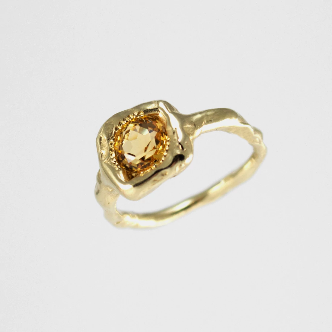 A "MOLD ART" gyűrű öntési technológiával készült tömör 14 karátos, 585% finomságú aranyból. A gyűrű központi részén, lekerekített tokos, zárt foglalatban sárga valódi citrin drágakő található. A Mold Art kollekció jegyeivel készült, rusztikus, de ugyanakkor kifinomult felületet a hétköznapitól elrugaszkodott módon teszi egyedivé a gyűrűt. Jól kombinálható más ékszerekkel és kiegészítőkkel.