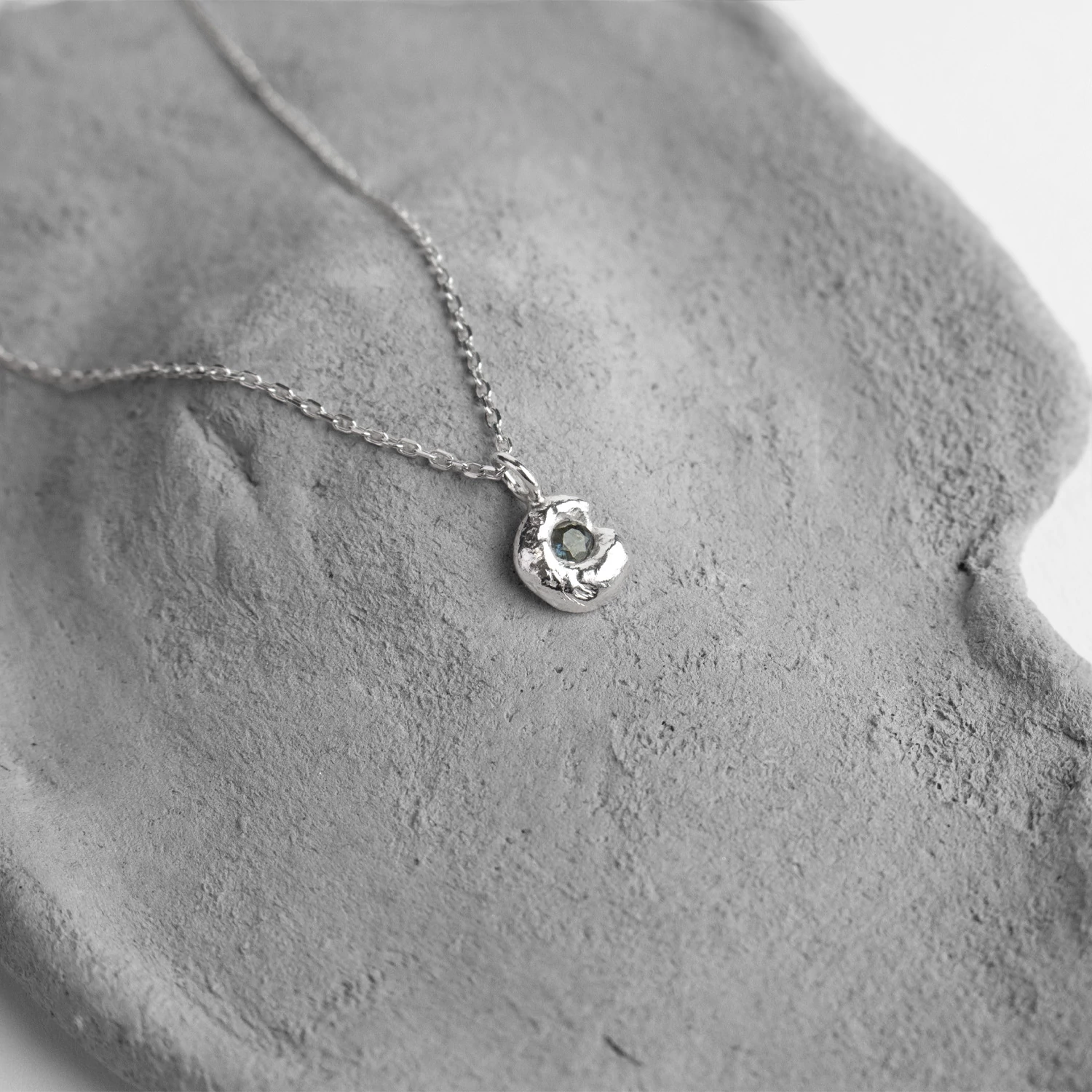 A kollekció jegyeit viselő nyaklánc központi eleme egy természetes világoskék zafír drágakő, amelyet tömör 925% ezüst ölel körül. A Drops ékszerek a Mold Art kapszulakollekciói amelyek egyedi technikával készülnek: a kövek a fém olvasztásának folyamatában kerülnek az anyagba, ahol az olvadó ezüst lágyan körbefonja őket, így születnek meg megismételhetetlen formáik.