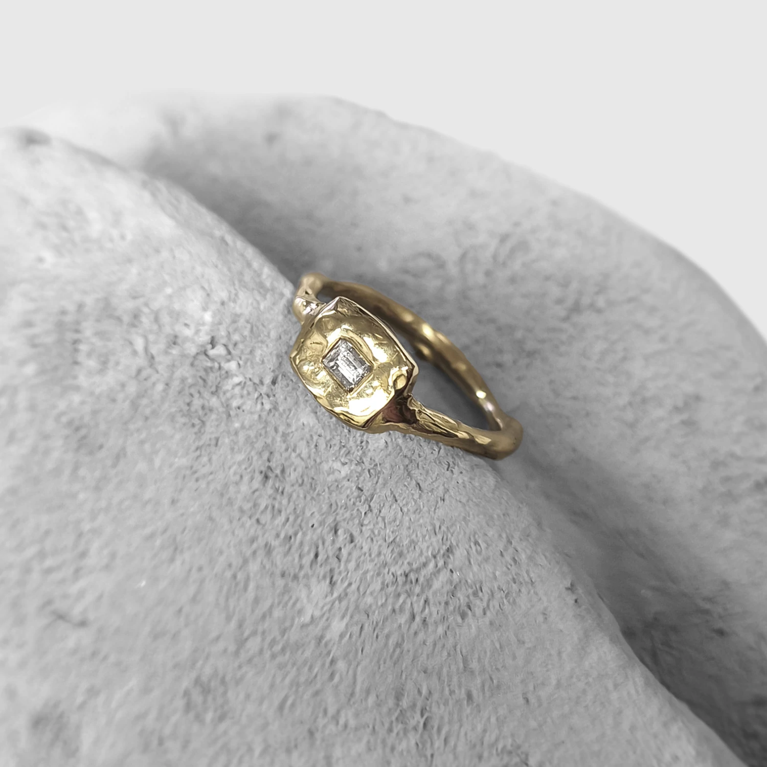 A Mold Art kollekció a minimalista dizájnt és a modern ékszerkészítést ötvözi. Ez a gyűrű tömör, rusztikus felületű, középen bagett csiszolású természetes valódi gyémánttal. Az organikus textúrák és a markáns forma jól bírja a mindennapi használatot, de különleges alkalmakra is ajánlott.
