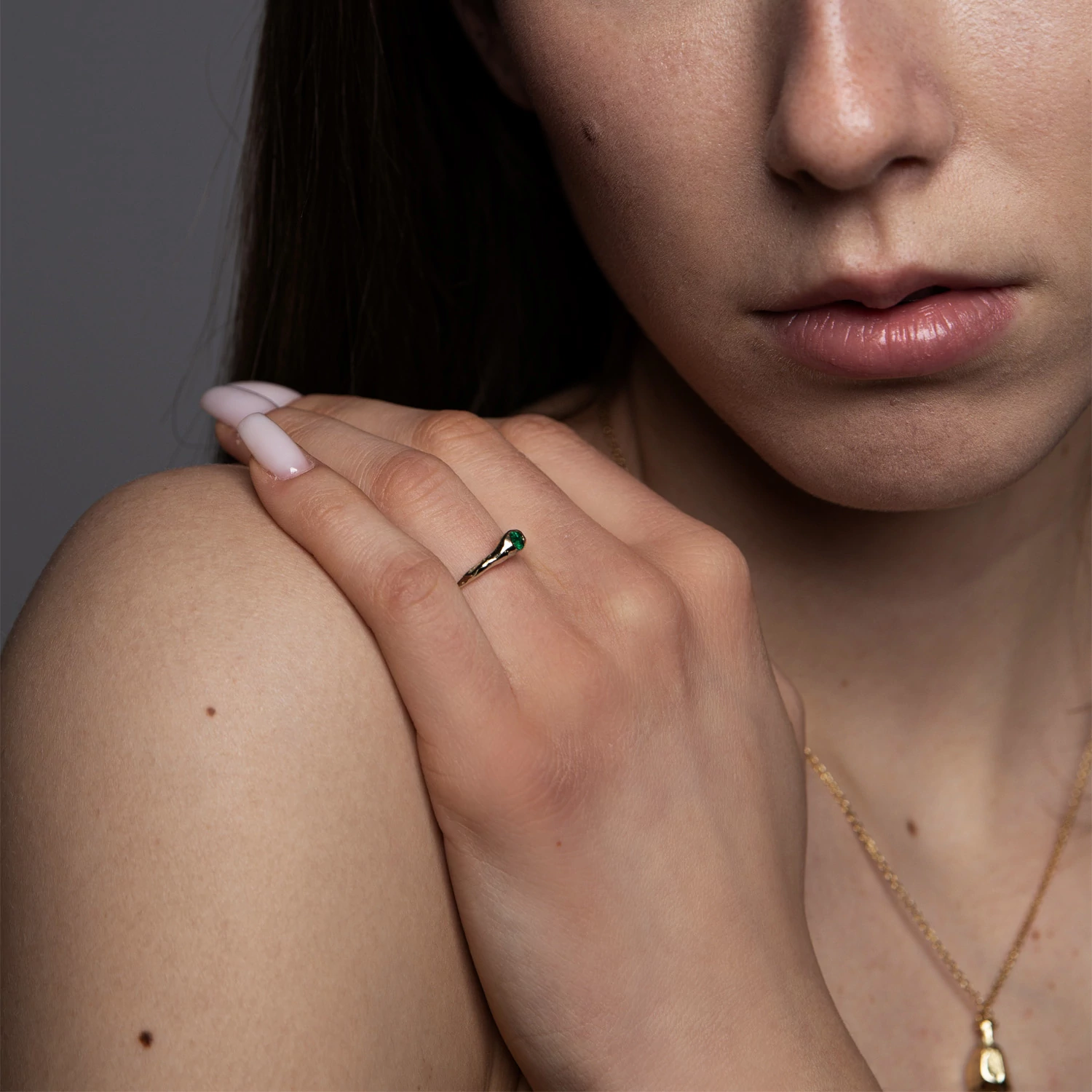 A Mold Art kollekció tökéletesen ötvözi a minimalista dizájnt és a modern ékszerkészítés művészetét. Ezt a gyűrűt rusztikus felülete és a benne foglalt valódi smaragd teszi különlegessé.