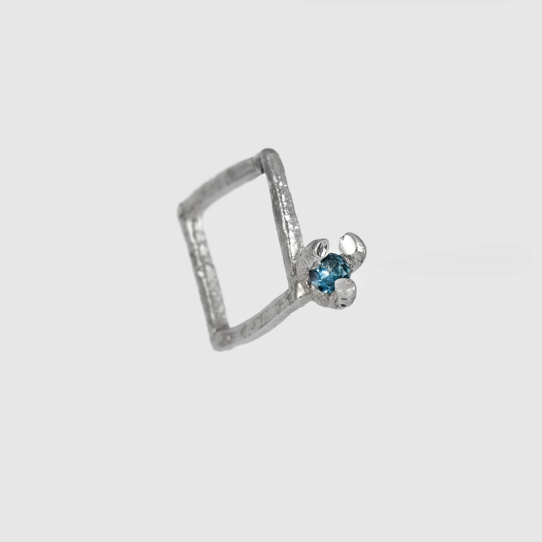 A kollekció jegyeit viselő gyűrű központi eleme egy természetes kék topáz drágakő, amelyet tömör 925% ezüst ölel körül. A Spark ékszerek a Mold Art kapszulakollekciói, amelyek egyedi technikával készülnek: az anyagot szinte olvadásig hevítem ezáltal egyedi megismételhetetlen textúrát kap, ezután kerül bele a központi drágakő. A gyűrű foglalata szándékosan kimagaslik, ezáltal is hangsúlyozva a kő ragyogását és különlegességét.