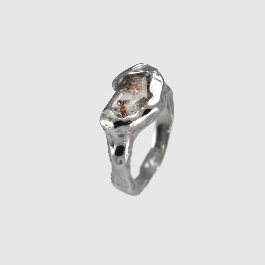A Mold Art kollekció jegyeivel készült rusztikus kialakítású gyűrű központi eleme egy valód természetes rutiltűs topáz drágakő.