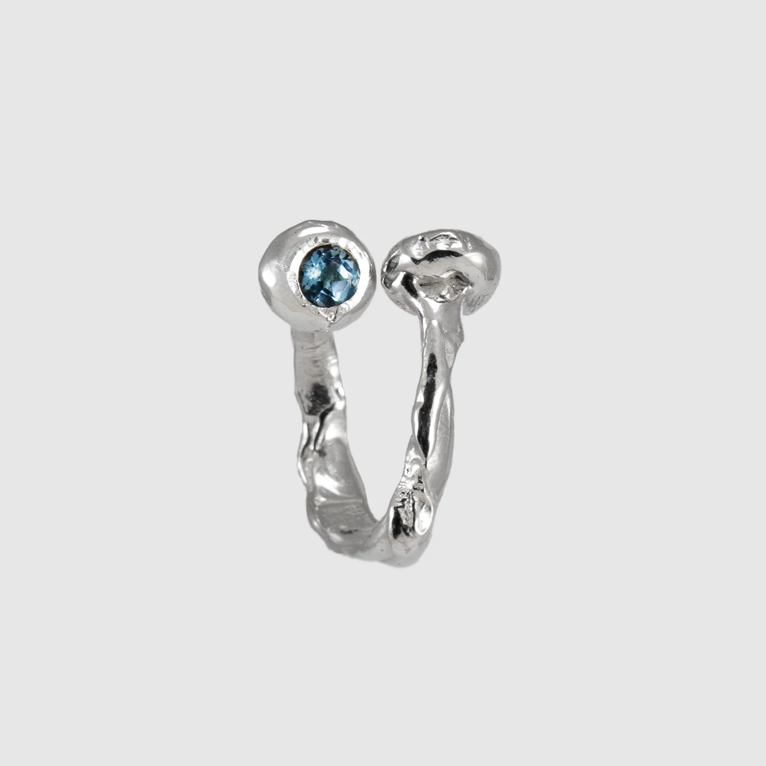 A gyűrű tömör, organikus kialakítása tartósságot és határozott megjelenést kölcsönöz, ezért mindennapi viseletre is ideális. Nyitott kialakításának köszönhetően kényelmes viselni. A gyűrű egyik oldalába valódi kék topáz, a másik oldalában pedig színtelen világos topáz kő található.