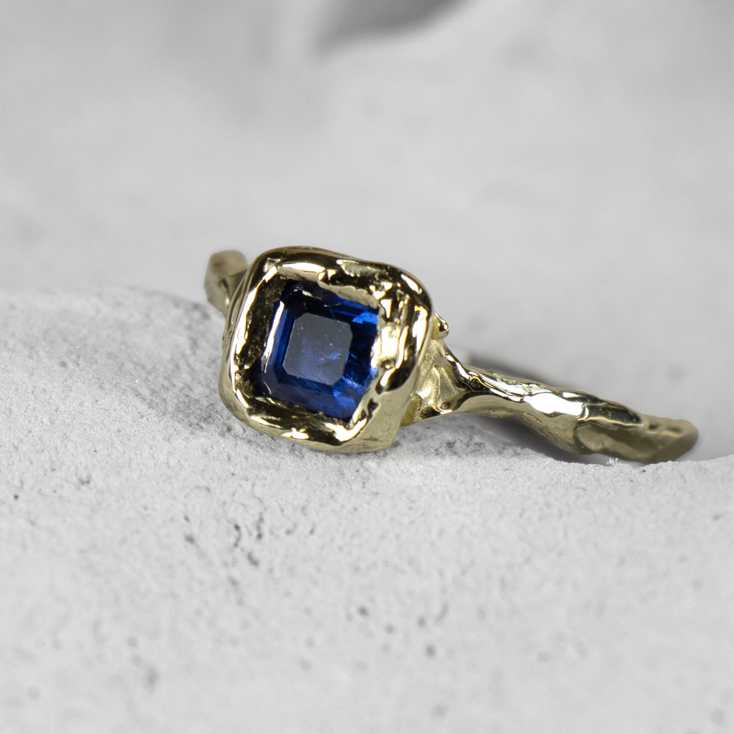 A Mold Art kollekció tökéletesen ötvözi a minimalista dizájnt és a modern ékszerkészítést. Ezt a gyűrűt rusztikus felülete és a benne foglalt valódi természetes kék zafír teszi különlegessé. A gyűrű tömör kialakításának köszönhetően mindennapi viseletre is alkalmas.