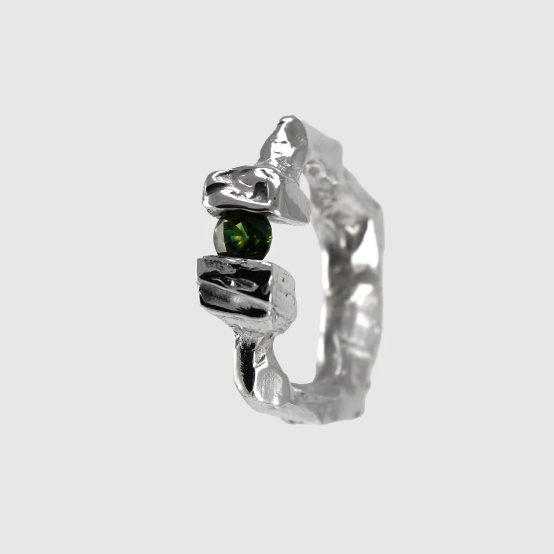 A Mold Art kollekció jegyeivel készült rusztikus kialakítású robusztus gyűrű központi eleme egy valód természetes zöld színű zafír drágakő.