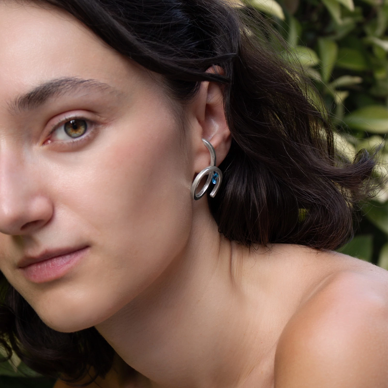 A fülbevaló a kollekció védjegyeivel készült ami az egyszerű, minimalista dizájn és a két anyag közé szorított lebegő kő. A fülbevaló különlegessége a csavart forma ami egészen a fülkagylóig felcsavarodik. A különleges kialakítást fokozzák a tengerkék színű topáz drágakövek.