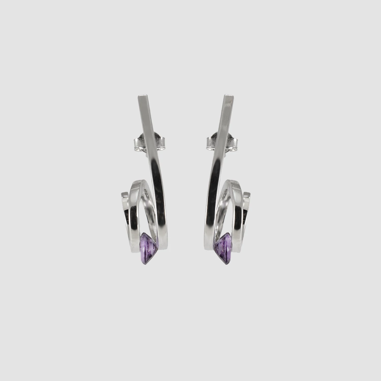 A kollekció védjegyével készült fülbevaló egyszerű, minimalista dizájnját a két anyag közé szorított lebegő ametiszt kövek teszik különlegessé. A csavart forma tovább fokozza az egyediséget.